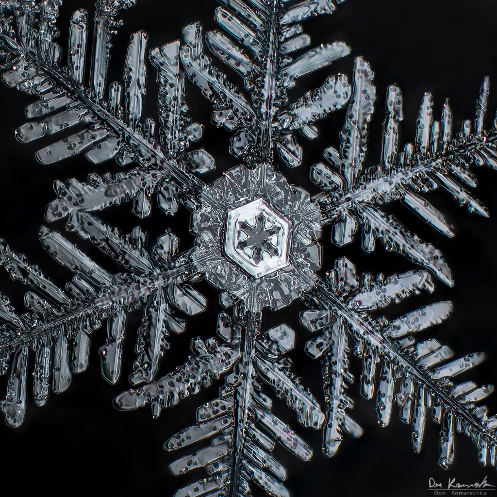 You might also notice a large number of small circles spread across the branches. These circles are tiny water droplets that collided with the snowflake as it fell to Earth. They almost look like tiny impact craters.